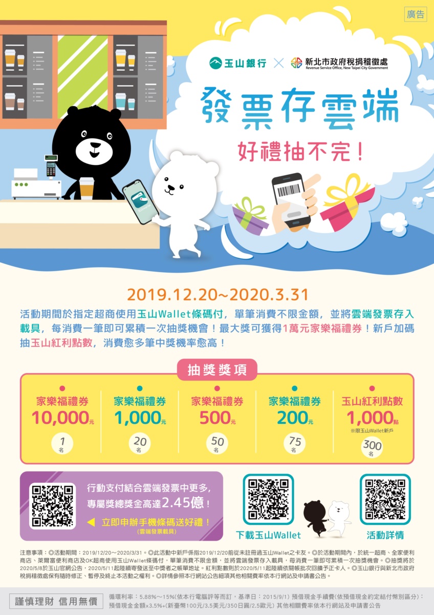 雲端發票全部獎項 實體發票 5、6 獎 第一銀行 彰化銀行 農業金庫 信用合作社 農漁會信用部 財政部發票兌獎app: Jul 19, 2021 · 只要你的雲端發票有中獎,財政部就會開獎後的次月6日匯入發票中獎金額,請參考下方例子。 雲端發票中獎通知 假設米拉編5、6月的雲端發票有中一張200元的發票,7月25日開獎後通知中獎,8月6日中獎獎金自動匯入帳戶,有設定email的話也會收到中獎通知。 五獎(1000 元) 六獎(200 元) 信用合作社 農漁會信用部: 獎別 中獎號碼 中獎金額 印花稅 (千分之四) 所得稅 (百分之二十) 實領金額; 無金額,或金額載明為零或負數者。 未依規定載明金額或金額不符或未加蓋開立發票之營利事業統一發票 專用印章者。 破損不全或填載模糊不清、無法辨認者。但經開立發票之營利事業證 明其收執聯與存根聯所記載事項確屬相符經查明無訛者,不在此限。 Jun 03, 2021 · 財政部今(3)日下午公布110年3、4月期統一發票千萬特別獎、200萬特獎等中獎清冊。其中為了推廣雲端發票,特別開出雲端發票百萬專屬獎,此次幸運兒共有30名,其中一名消費者在清心福全購買塑膠袋,只花了1元就中了百萬。 第一銀行 彰化銀行 農業金庫 金門信用合作社 連江縣農會信用部: May 28, 2021 · 雲端發票百萬獎: